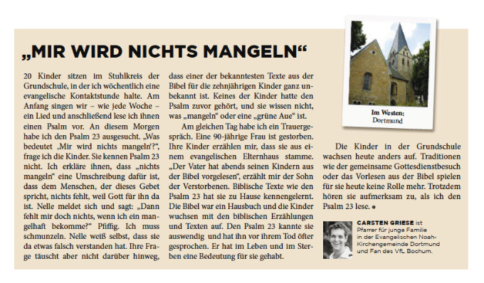Sonntagmorgen. Zwei Babys liegen im Arm ihrer Eltern, drei Kindergartenkinder sitzen in der ersten Reihe der Kirche und schauen mit erwartungsvollem Blick auf das Taufbecken. Fünf Kinder werden heute getauft. Tief im Dortmunder Westen. Es ist unruhiger und lauter als in einem „normalen“ Gottesdienst. Vor den Taufen bitte ich die Gemeinde, das Apostolische Glaubensbekenntnis zu sprechen. Es wird still. Ich fange an und höre, dass nur wenige das Bekenntnis mitsprechen. Viele Gäste lesen das Glaubensbekenntnis im Gesangbuch still mit oder hören einfach zu. Es ist für sie ein unbekannter Text. Die Presbyter, die Leiterin der Kindertageseinrichtung, einige treue Gottesdienstbesucher und ich bekennen unseren christlichen Glauben in der voll besetzten Kirche.